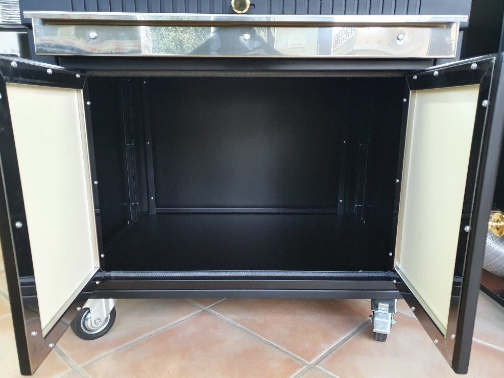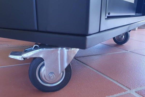 - Chariot équipé de quatre roues (dont 2 pivotantes avec frein) pour faciliter le déplacement et le bloquer en position de travail. Chariot pouvant servir de coffre à outils, équipé d'une ouverture à deux portes avec serrure d'ouverture par loquet extractible. Hauteur du barbecue avec chariot 84 cm.