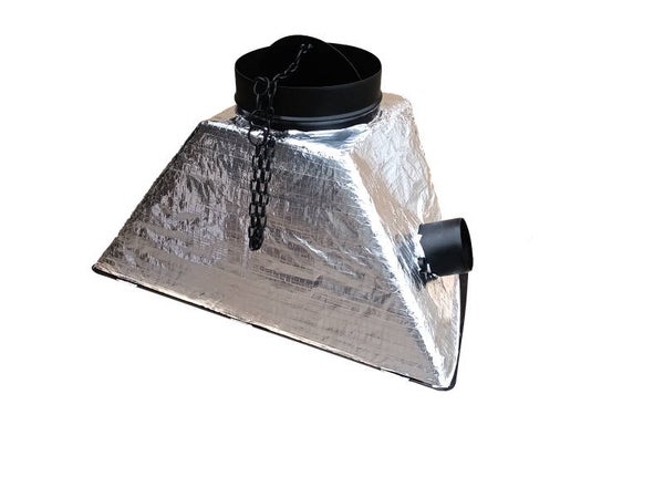 La capuche possède 2 aérations latérales diam. 100, une prise d'air froid recyclé prélevé dans la pièce, et l'autre refoulement, à relier à une grille de ventilation pour diffuser la chaleur produite dans le milieu environnant.