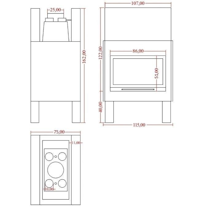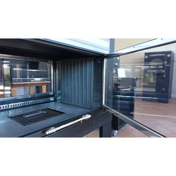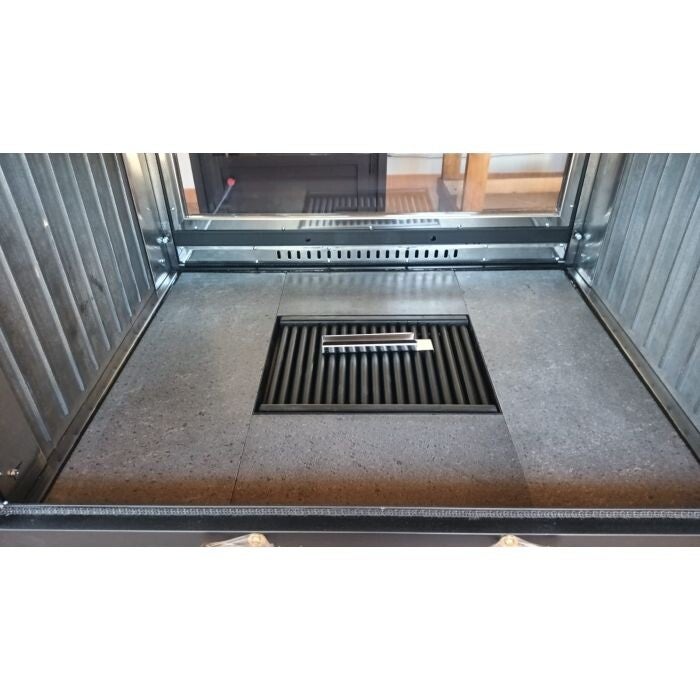 - Grand foyer en pierre de lave fine de 50 mm d'épaisseur, avec grille à cendres au centre mesurant L 35 x P 23 cm réalisée en fer rond robuste et rotatif pour ne pas subir de dilatation, avec tiroir à cendres amovible. Ajustement minutieux de la surface du feu en pierre de lave à l'aide de boulons en dessous