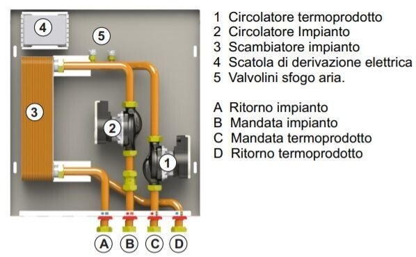 - Grâce au module, il est possible d'effectuer la fonction de chauffage de l'unité d'habitation en exploitant la chaleur produite aussi bien par une chaudière à combustible solide (vase ouvert ou fermé) que par une chaudière à gaz traditionnelle, en séparant hydrauliquement les deux circuits via un échangeur à plaques.