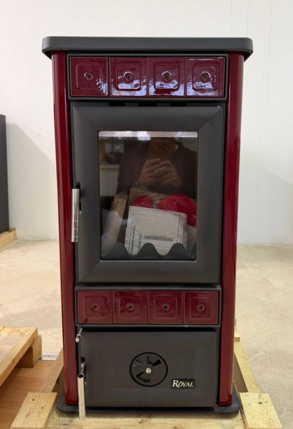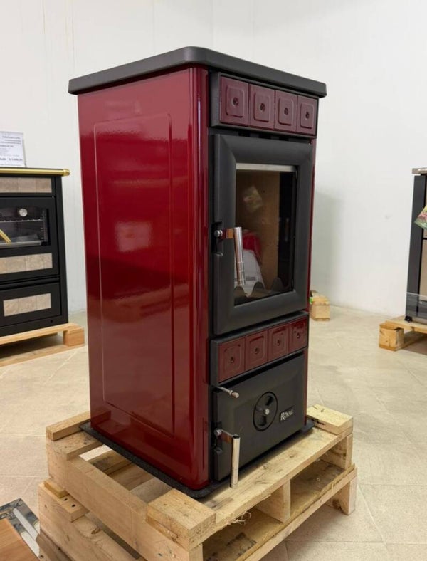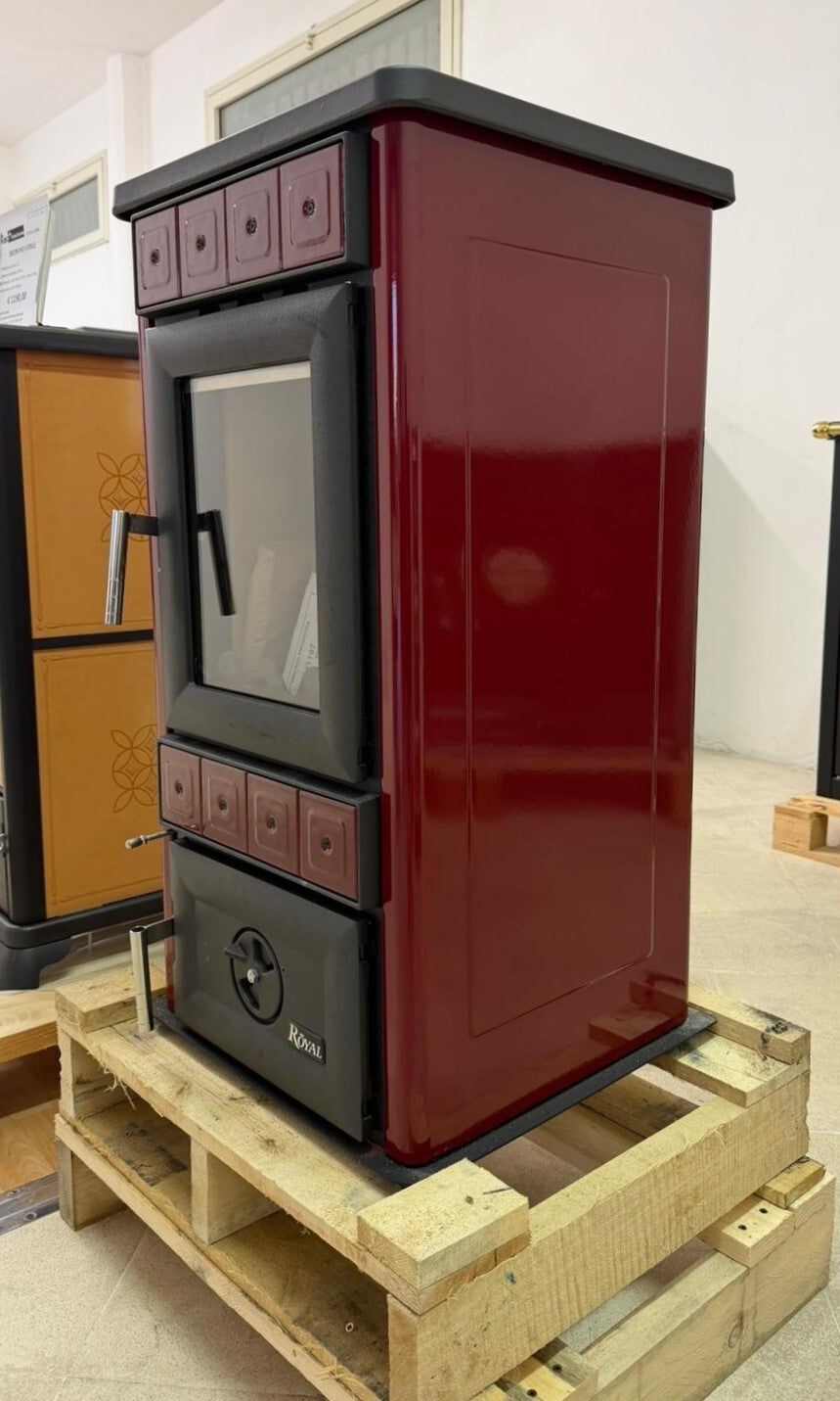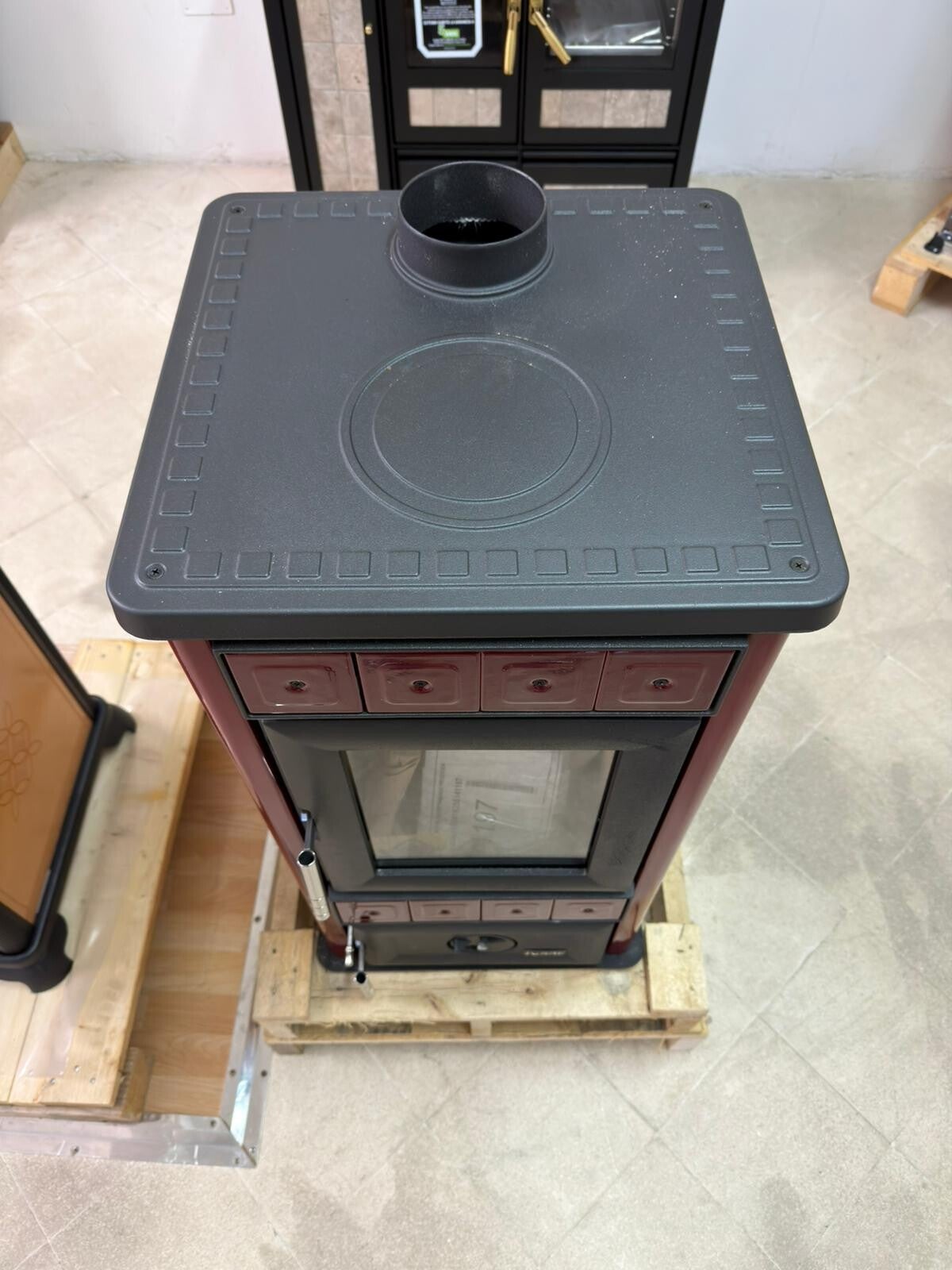 Poêle à bois traditionnel avec côtés en acier émaillé, façade en céramique et dessus en fonte. Le foyer est en matériau réfractaire et comprend un grand cendrier avec système de secouage. La porte du foyer, en fonte avec vitre en céramique, est équipée d'un système autonettoyant qui assure une meilleure visibilité des flammes.